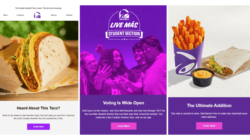 One of Taco Bell’s key strengths lies in using email to engage younger audiences. Campaigns integrate humour, eye-catching graphics, and links to social media challenges, encouraging subscribers to share content and participate in online conversations. These emails not only drive foot traffic and sales but also reinforce Taco Bell’s identity as a fun, culturally relevant, and innovative brand.